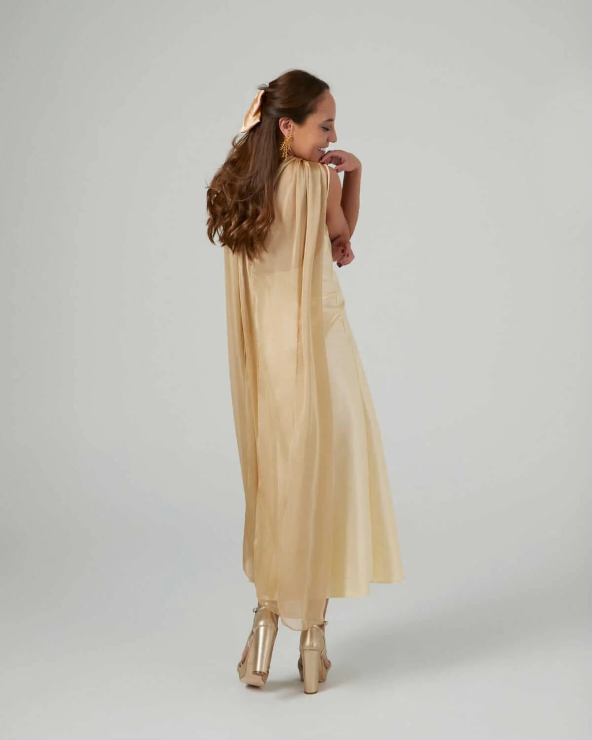 Capa de invitada en gasa catiónica de doble hilo en color dorada.