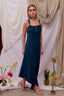 Simple pero muy especial, este vestido azul petróleo de corte asimétrico tiene la opción de dejar la espalda al aire y el escote abierto o lucirlo con un top del mismo tejido y color en el interior.