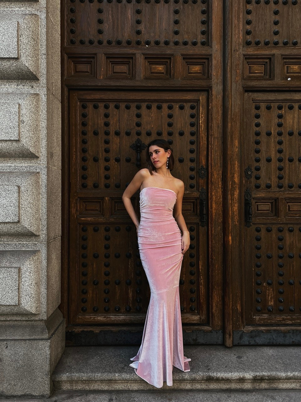 Vestido de terciopelo con escote palabra de honor. Su tejido fino y su corte de sirena te garantiza la máxima comodidad a la vez que le saca todo el partido a las curvas de tu cuerpo. Digno de alfombra roja, combínalo con una capa para lucirlo en todo su esplendor.